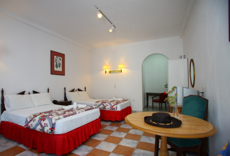 The spacious family rooms of Dolphin Hotel are a great choice for a relaxing vacation for families with children or a group of friends. They are consisted of one spacious room with two double beds at 1.50m width each one and a sofa bed. They can accomodate up to 5 guests. All rooms are equipped with fridge, AC, TV, hair dryer and WC with douche.